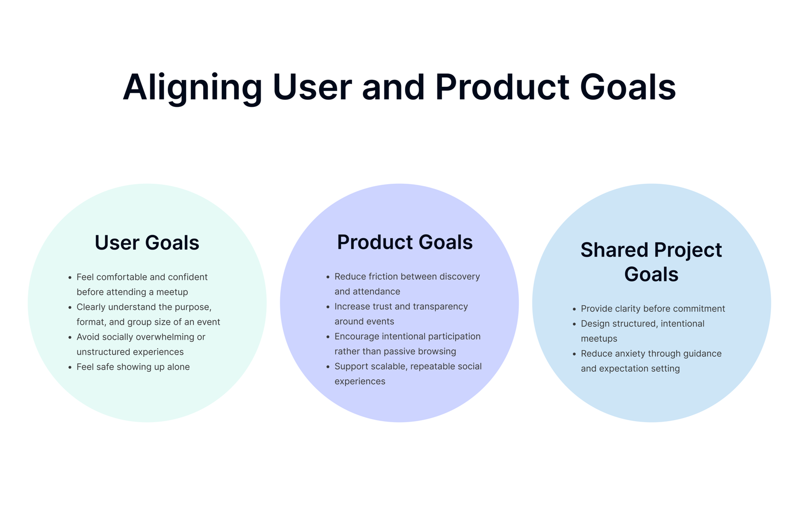 To stay focused, I evaluated the project through the lens of overlapping user and business goals. Research showed that while users want real-world connection, they also need reassurance, clarity, and emotional safety before committing to social experiences. At the same time, the product must encourage engagement, trust, and repeat participation.