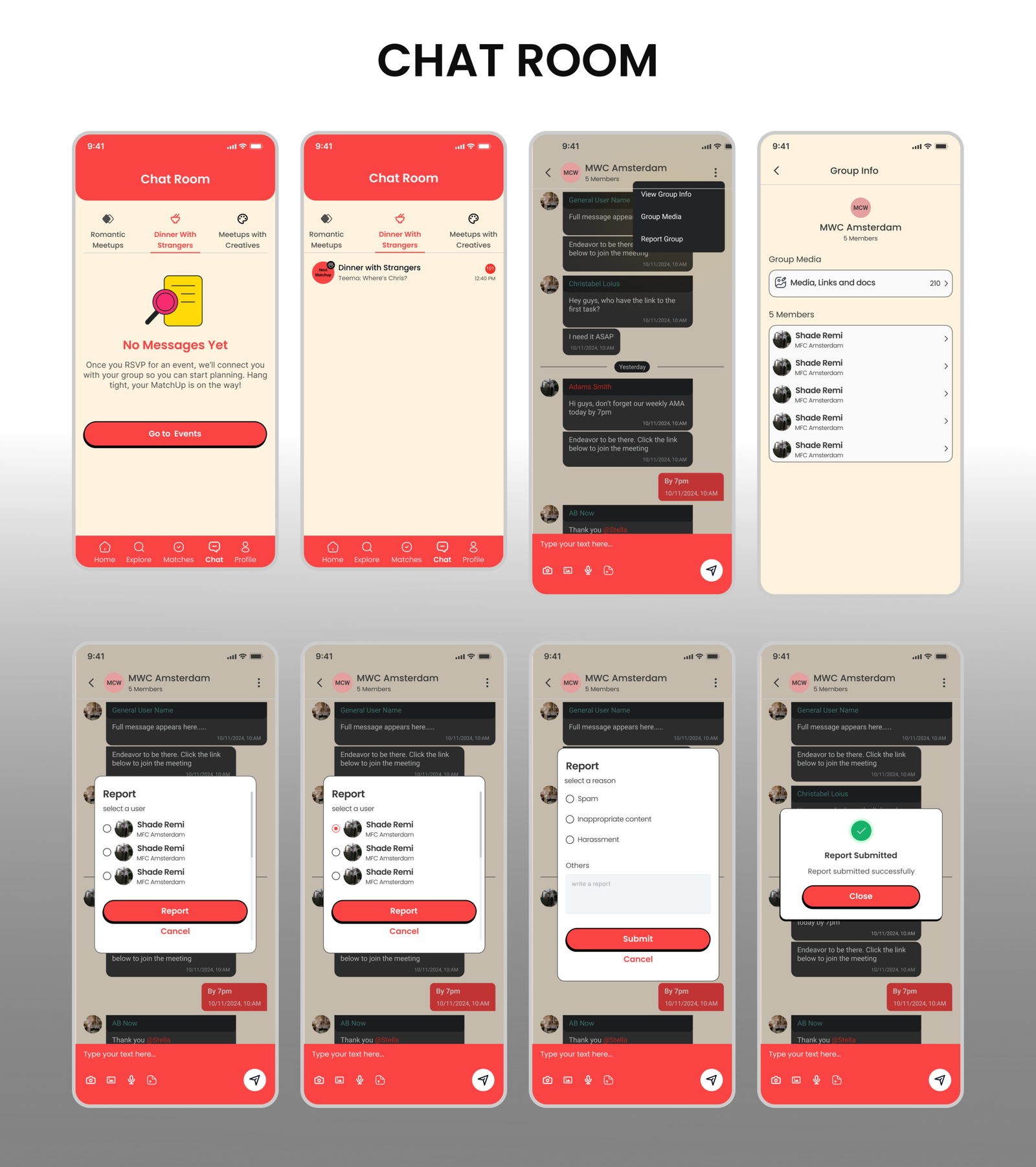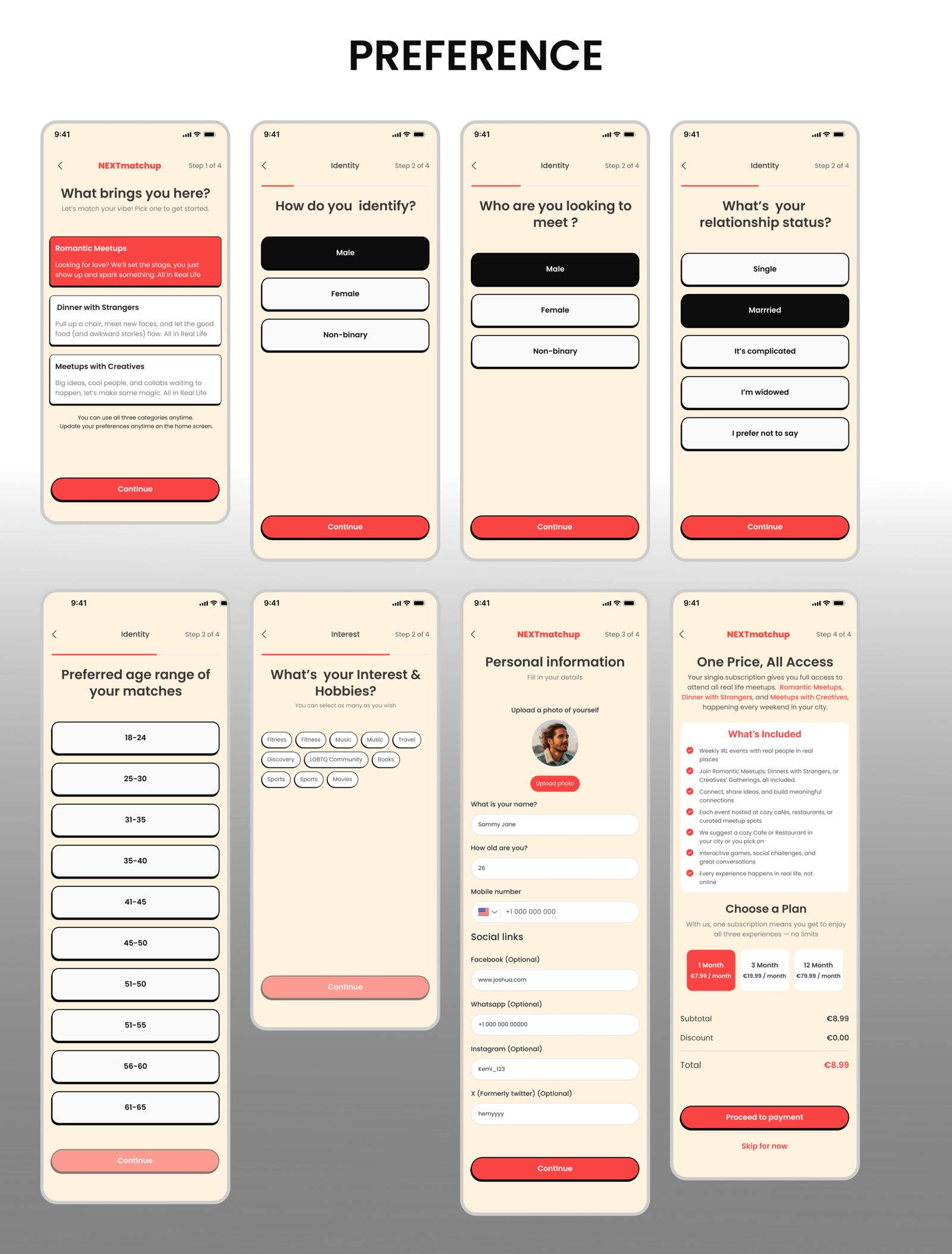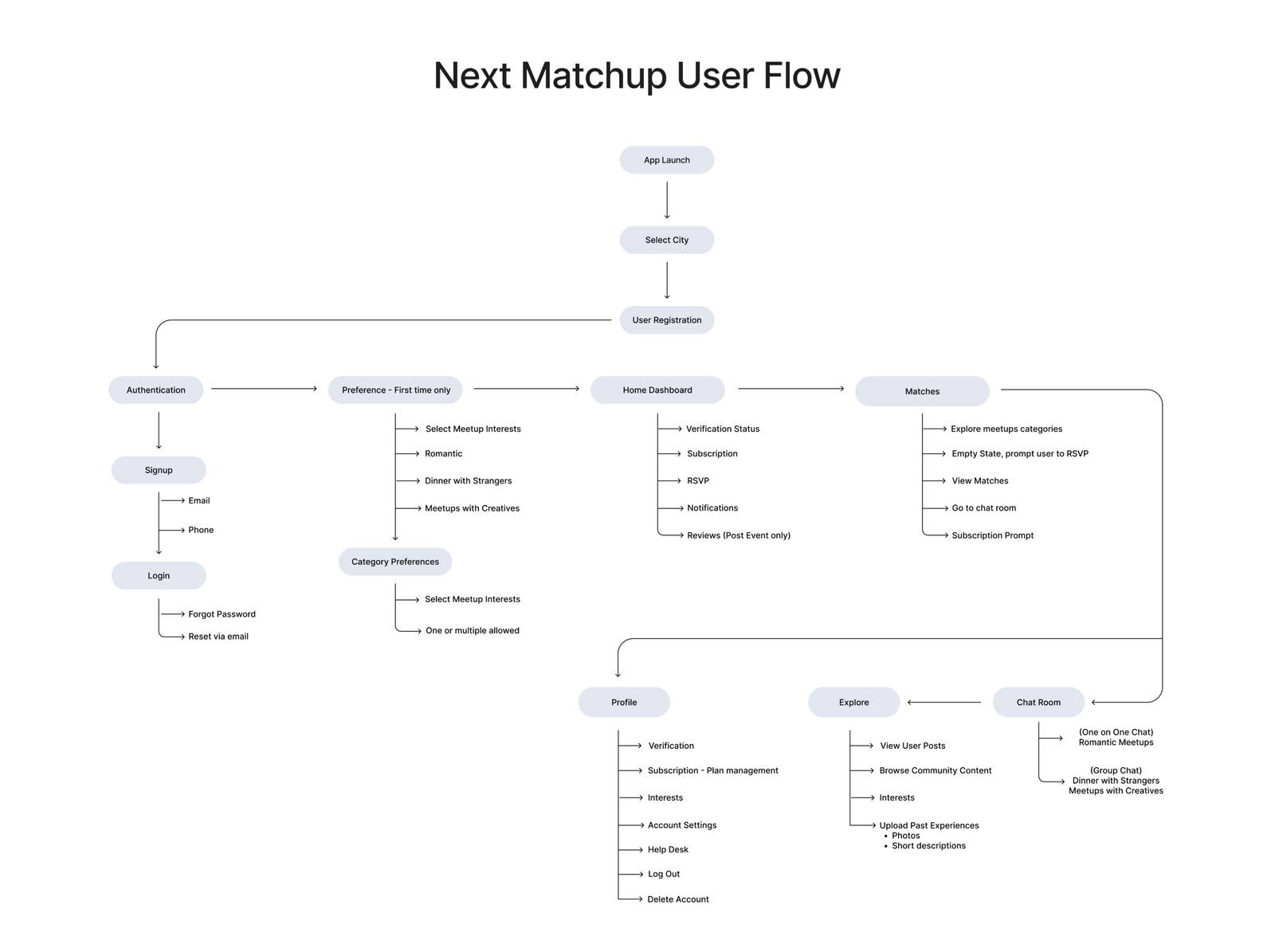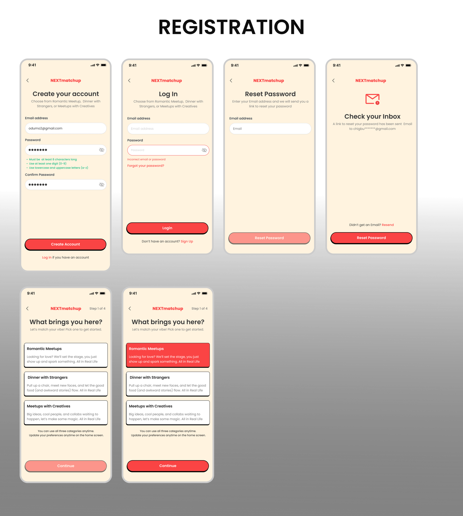 The final solution is a human centered product built around simplicity, intention, and guided social experiences. Through research, UX strategy, and consistent visual design, NextMatchUp introduces a category driven system that removes guesswork and aligns users with the type of connection they seek. With minimal chat, small group meetups, and thoughtful interaction design, the platform encourages real world engagement while maintaining safety, clarity, and emotional comfort.