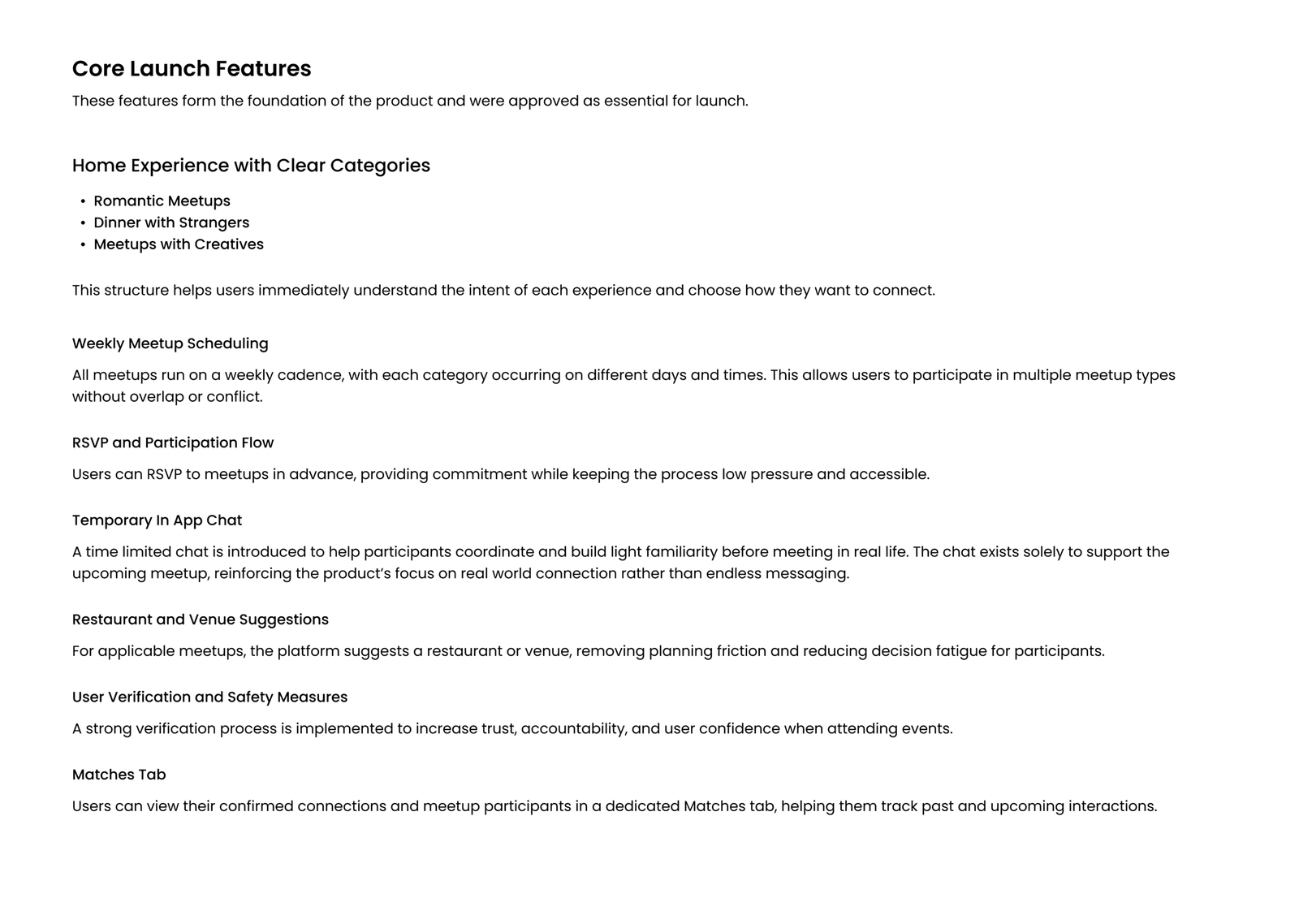To ensure NextMatchUp launched with a focused and realistic scope, features were prioritized based on approved product architecture, user research, and launch readiness. These features represent the core experience required for the initial release, designed to support trust, clarity, and real-world connection.