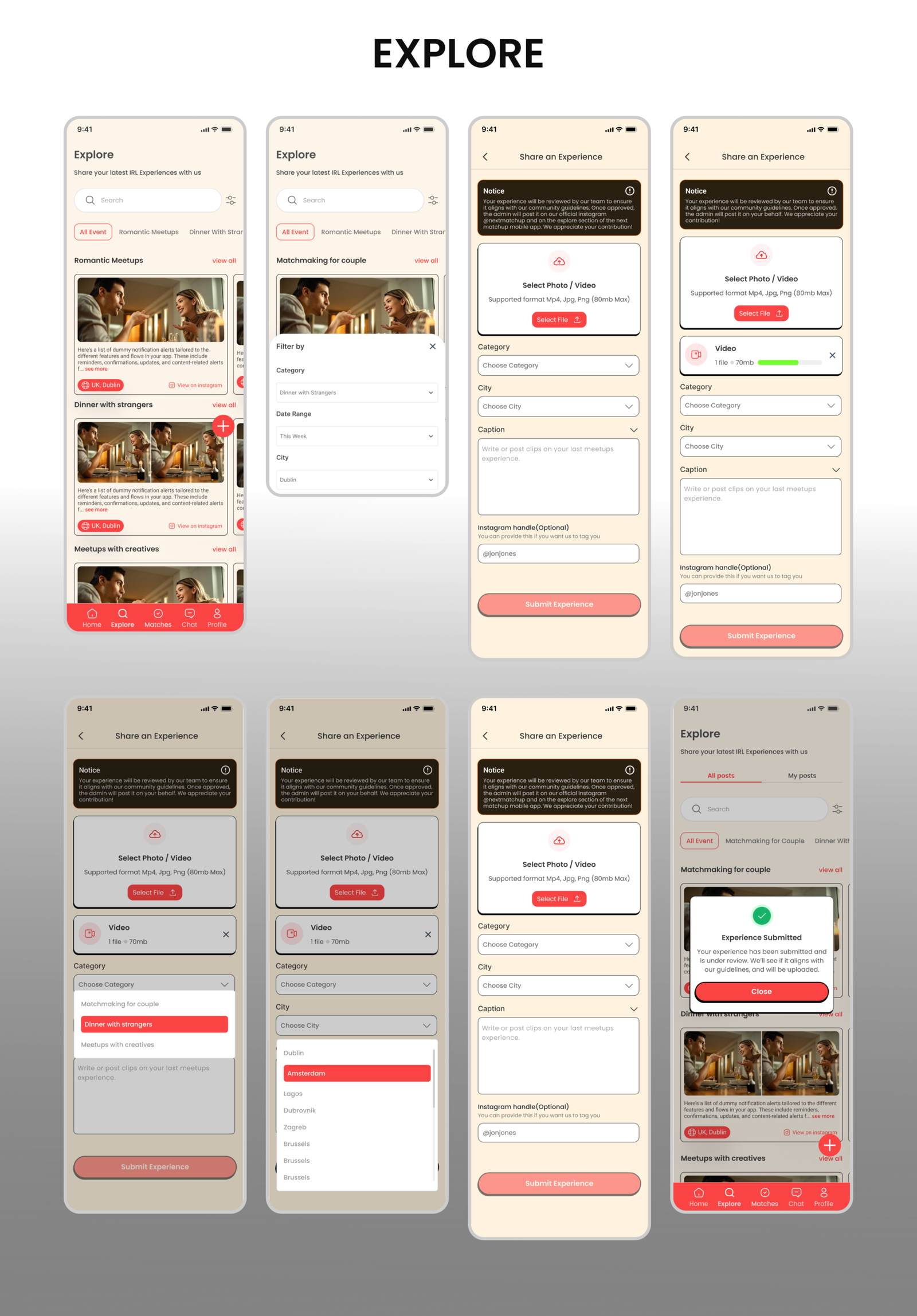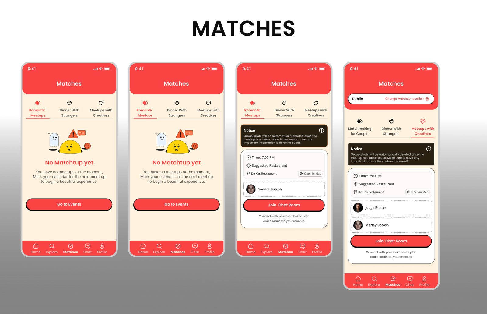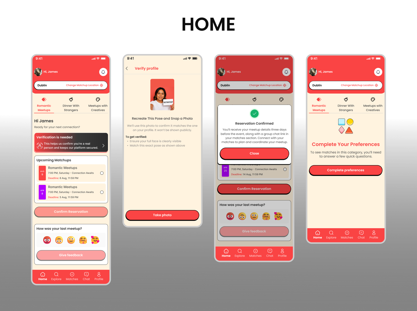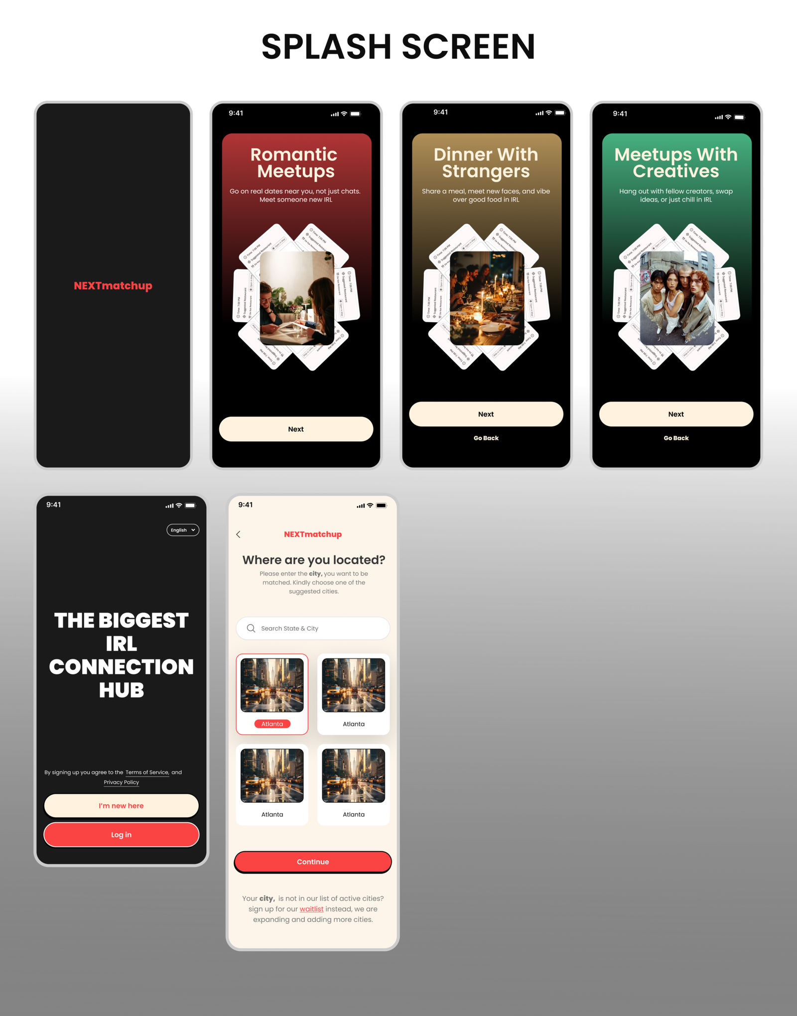 The goal was to design an end to end experience that transforms digital intention into real world connection. The project aimed to reduce emotional friction, create a clear pathway to join meetups, and build a structured ecosystem for romantic meetups, dinners with strangers, and creative collaborations. The objective was not only usability, but emotional clarity, trust, and safety across every interaction in the platform.