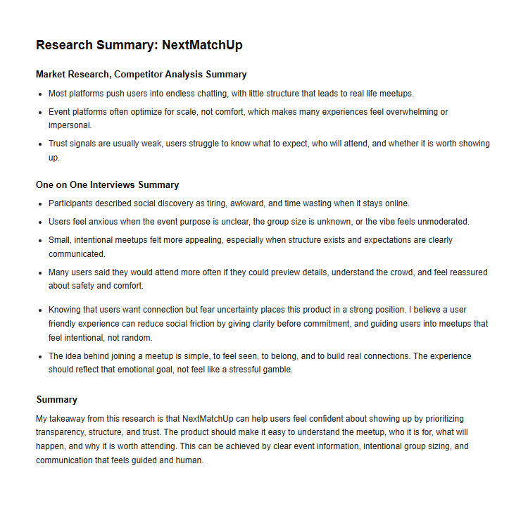 To design for real human connection, I first needed to understand the emotions behind the problem. By asking thoughtful questions and seeking clarity, I was able to move past assumptions and uncover the real barriers people face when trying to meet in person.