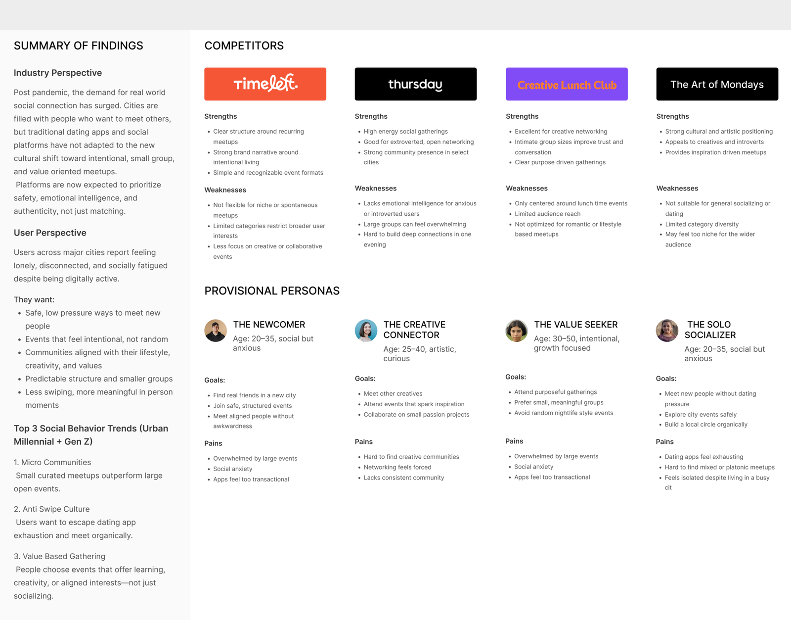 The decision to begin with a competitive analysis helped establish a clear understanding of the real life meetup landscape and the platforms currently shaping how people connect offline. By examining competitors like Time Left, Thursday Event, Creative Lunch Club, and Art of Monday, I was able to identify their strengths, weaknesses, and the gaps users consistently experience when trying to form meaningful in person relationships.