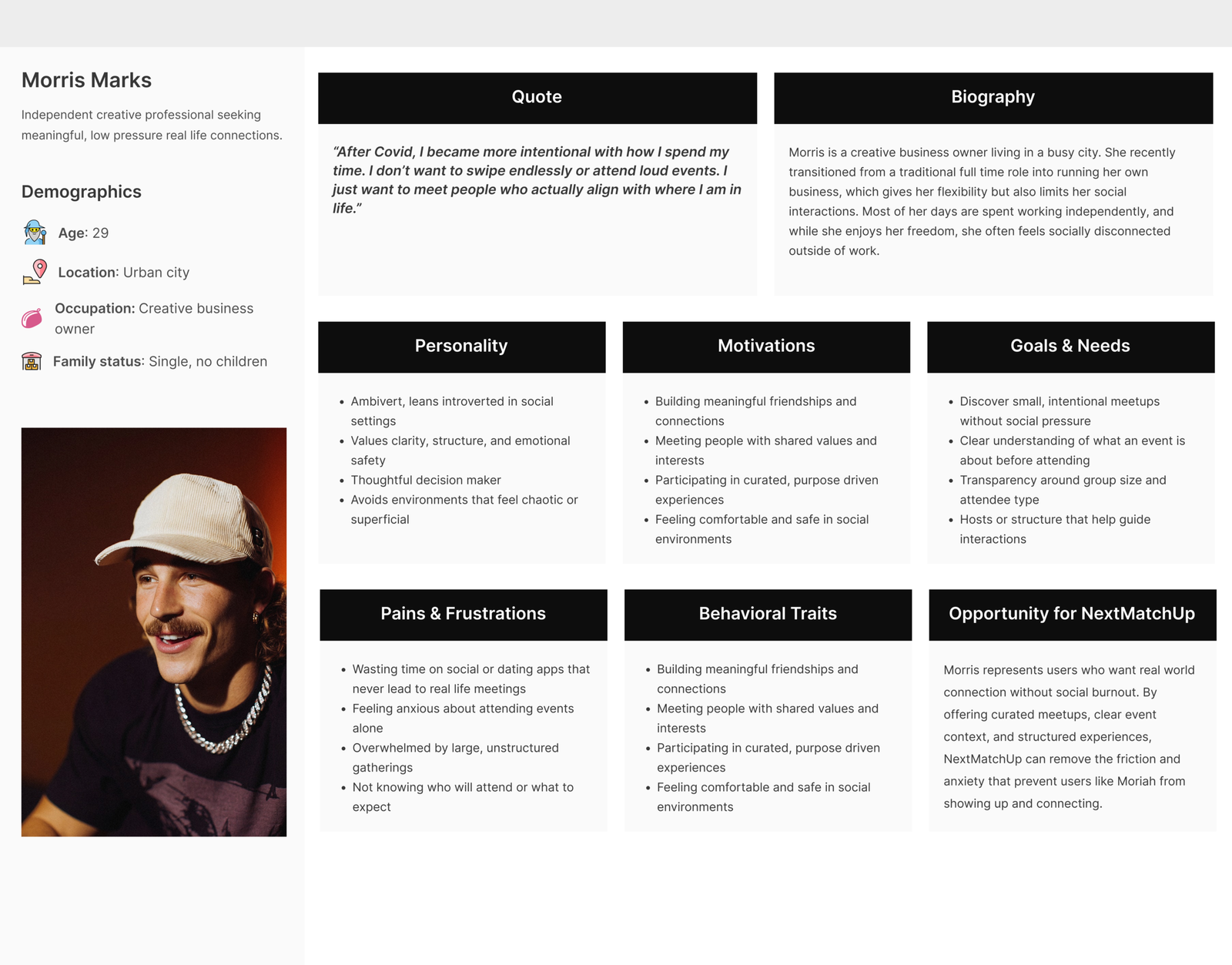 Based on my user interviews, I identified two key findings: the user’s motivations and the user’s needs. These insights were central to creating the persona and informed the overall direction of the project. (See findings below.)