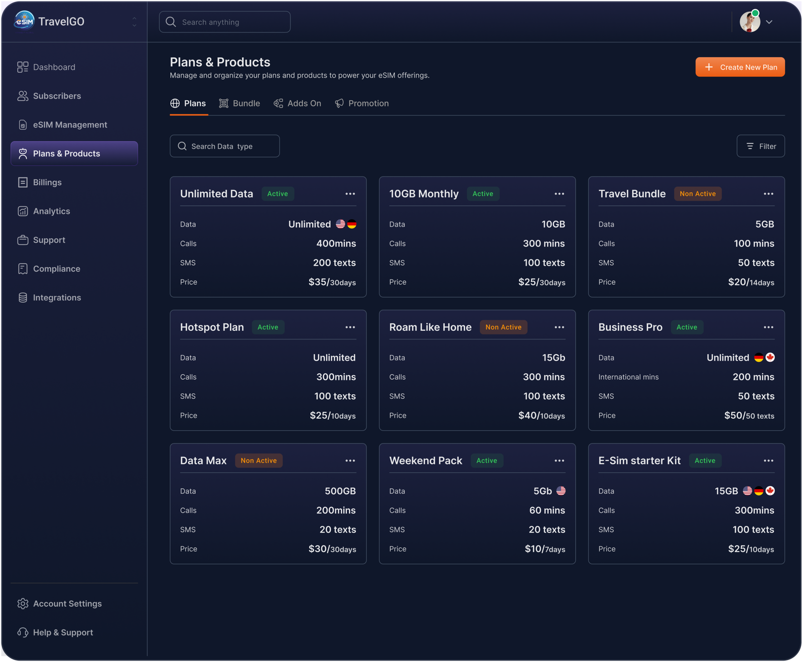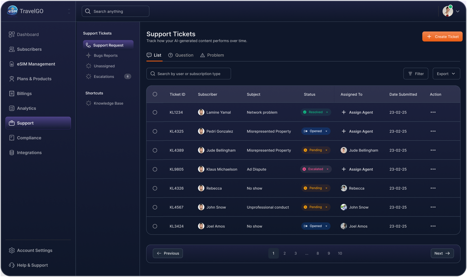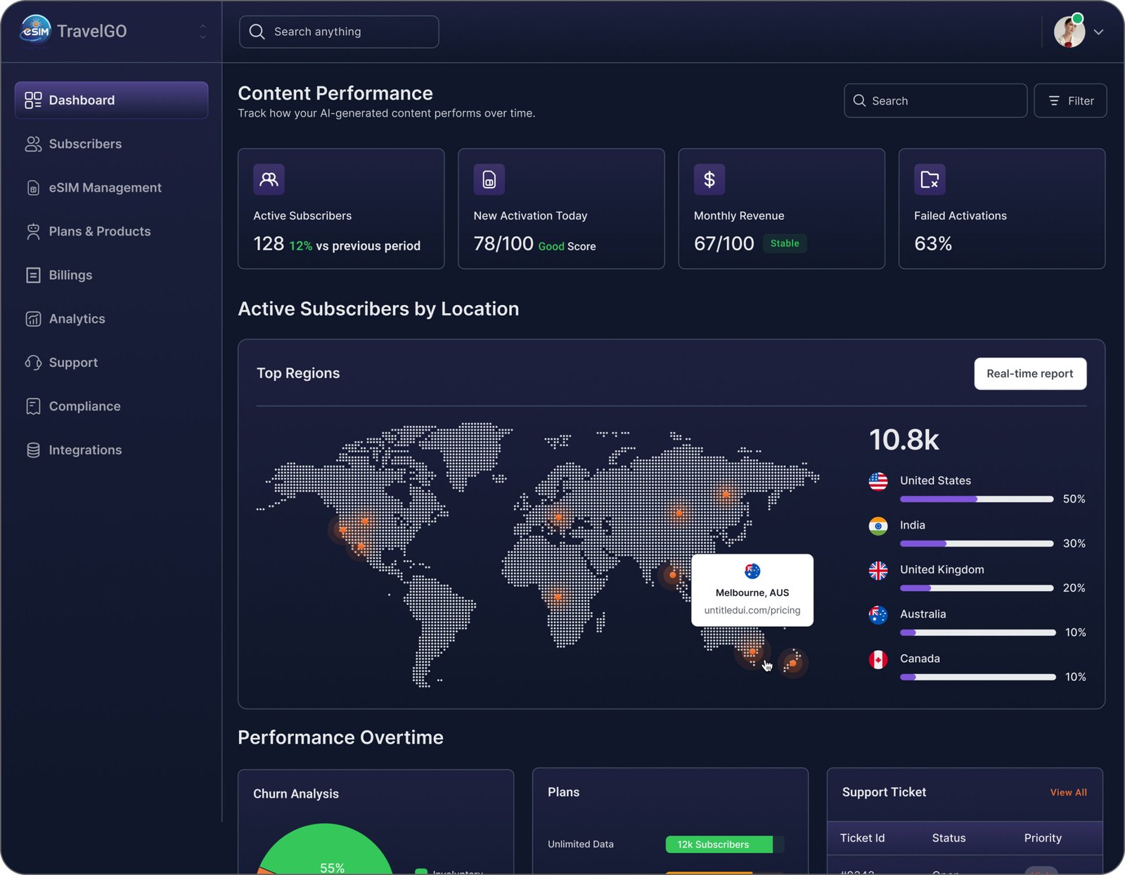 On the operations side, teams can monitor activations in real time, manage eSIM inventory, configure subscription plans, and track revenue performance through a centralized dashboard. On the support side, agents can resolve activation issues with full subscriber context and provisioning history.