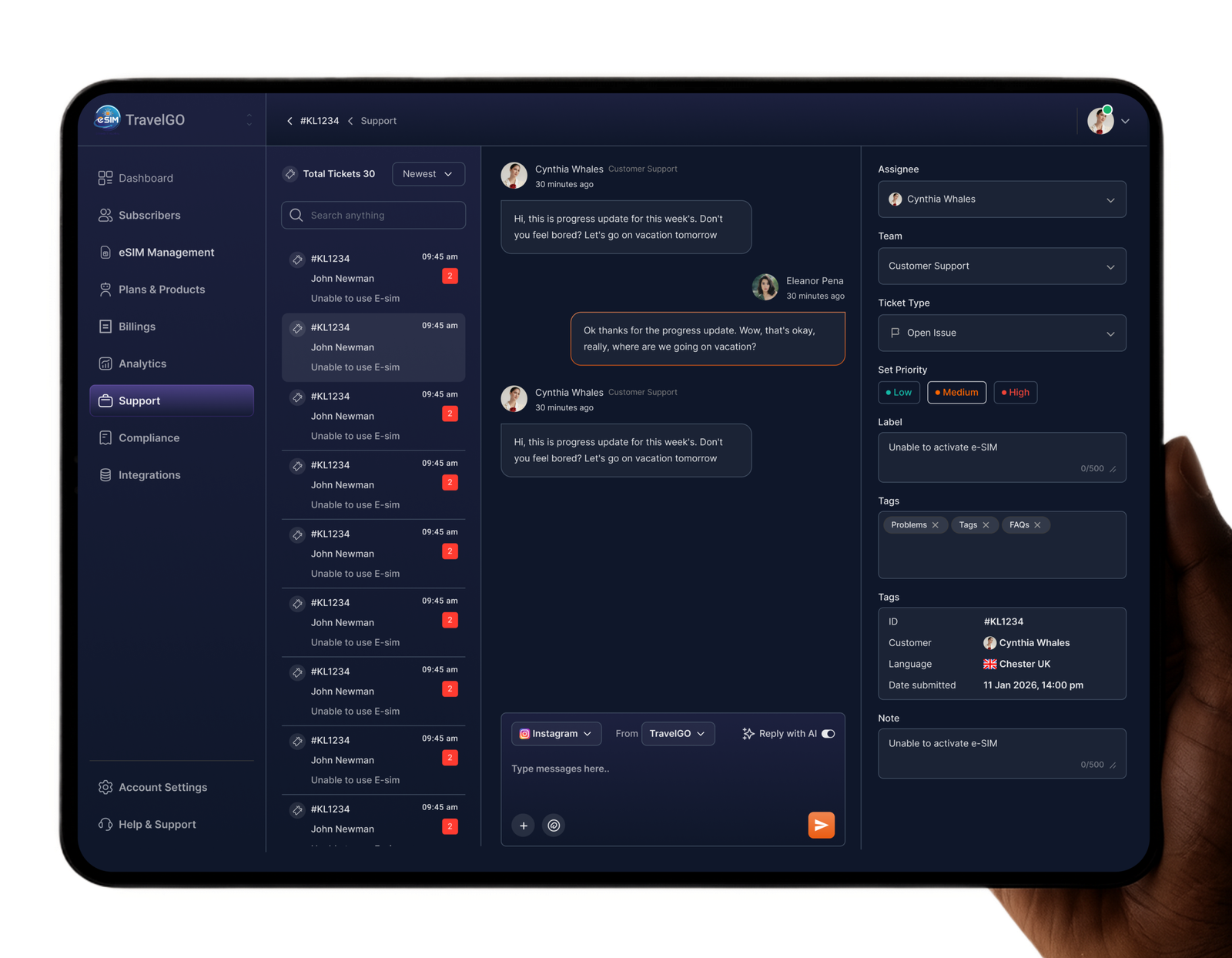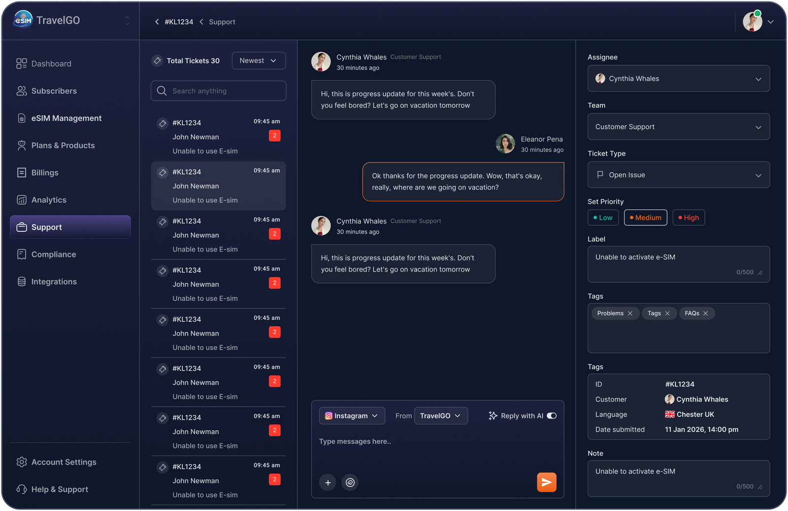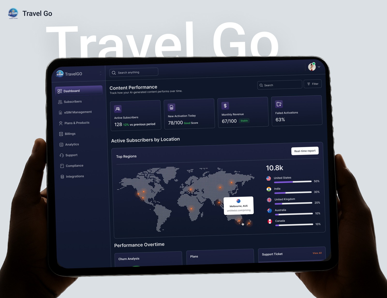 On the operations side, teams can monitor activations in real time, manage eSIM inventory, configure subscription plans, and track revenue performance through a centralized dashboard. On the support side, agents can resolve activation issues with full subscriber context and provisioning history.